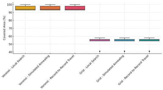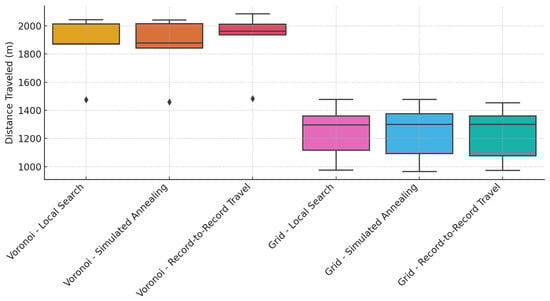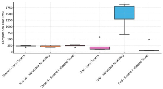 We conducted Python 3.8.3-based simulations to evaluate all combinations of the proposed framework, resulting in six different configurations: Voronoi with local search, Voronoi with record-to-record travel, Voronoi with simulated annealing, grid-based with local search, grid-based with record-to-record travel, and grid-based with simulated annealing. The simulations were performed on a PC equipped with an Intel Core i7-8550U processor, 16 GB of RAM, and an NVIDIA GeForce MX150 GPU. Please note that GPU is not utilized for path planning.