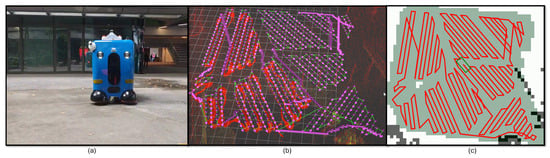 Robot hardware experiment results. (a) Panthera robot during the experiment; (b) coverage path of the robot; (c) covered area.