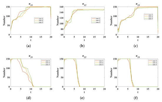 scenario 2: As shown in Figure 6, under the implementation of two control measures, the densities of the three categories, namely ignoramus and spreaders, are effectively suppressed when locally unstable, and gradually tend towards global stability over time. As indicated in Table 3, compared to Scenario 1, although the costs of the two control strategies increased by 23.34, the total density of the three types of ignoramus (I) decreased by 26.23 over the entire time period, with a decrease of 20.99 at the end of the period. The total density of the three types of spreaders (S) decreased by 2.89 over the entire time period, with a decrease of 0.54 at the end of the period. The total density of network platforms providing debunking information for rumors () decreased by 2.41 over the entire time period, with a decrease of 0.1 at the end of the period. The total cost decreased by 29.83. As shown in Figure 7, both types of control measures are bang–bang control strategies, further validating Remark 1.