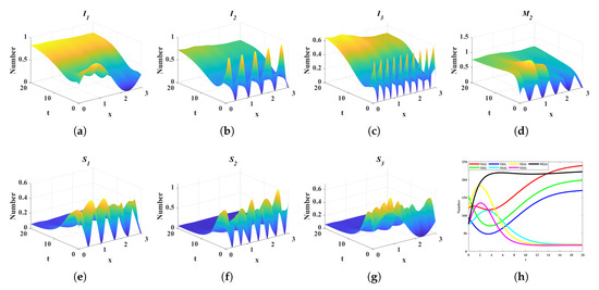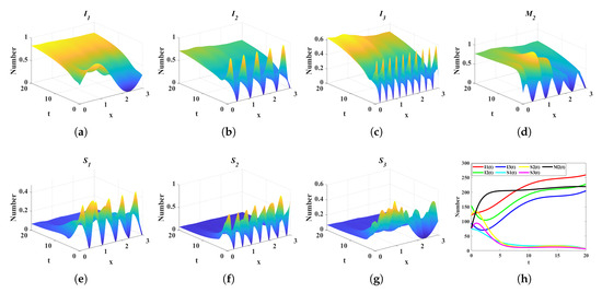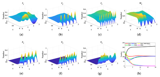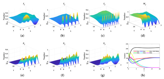 Dynamic evolution of state variables under scenario 4. (a) Spatiotemporal evolution of the ignoramus . (b) Spatiotemporal evolution of the ignoramus . (c) Spatiotemporal evolution of the ignoramus . (d) Spatiotemporal evolution of the media platform . (e) Spatiotemporal evolution of the spreaders . (f) Spatiotemporal evolution of the spreaders . (g) Spatiotemporal evolution of the spreaders . (h) Temporal evolution of the total spatial sum of densities for state variables , , , , , , and . (The spatiotemporal evolution of the control variable describes the dynamic variation of its density across the temporal interval to and the spatial domain to ).