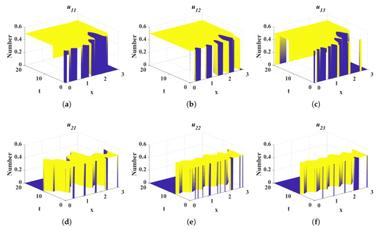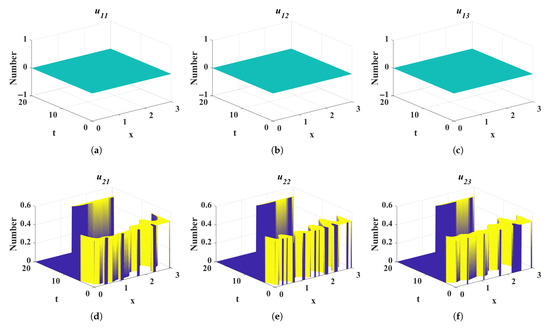 Dynamic evolution of control variables under scenario 2. (a) Spatiotemporal evolution of media preventive education measure . (b) Spatiotemporal evolution of media preventive education measure . (c) Spatiotemporal evolution of media preventive education measure . (d) Spatiotemporal evolution of media debunking control strategy . (e) Spatiotemporal evolution of media debunking control strategy . (f) Spatiotemporal evolution of media debunking control strategy . (The spatiotemporal evolution of the control variable describes the dynamic variation of its density across the temporal interval to and the spatial domain to ).