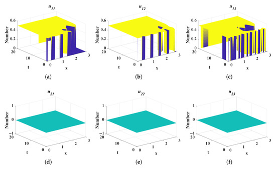 In this section, simulation experiments are conducted using MATLAB R2022a to validate the theoretical results presented in Section 2 and Section 3. The experiments are divided into two parts. First, the impact of different diffusion coefficients on the control variables of rumor propagation is analyzed to verify the adaptability of the media-based spatiotemporal optimal control strategy proposed in Theorem 2. Then, the total costs of several different control strategies are compared to validate the effectiveness of the media-based spatiotemporal optimal control measures presented in Theorem 2. For simplicity, m is set to 3. In other words, the simulation environment is set for a rumor propagation scenario in three different language environments. Additionally, take . The initial conditions are defined as follows: . Other parameters are provided in the Table 2.