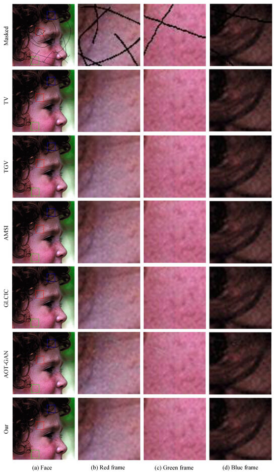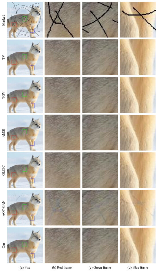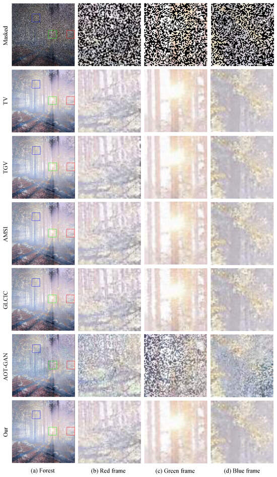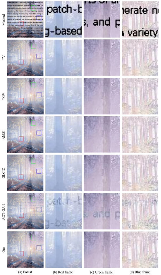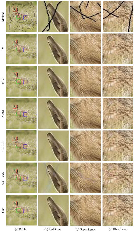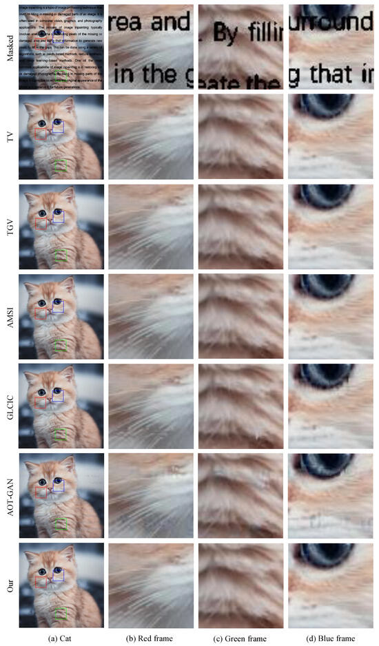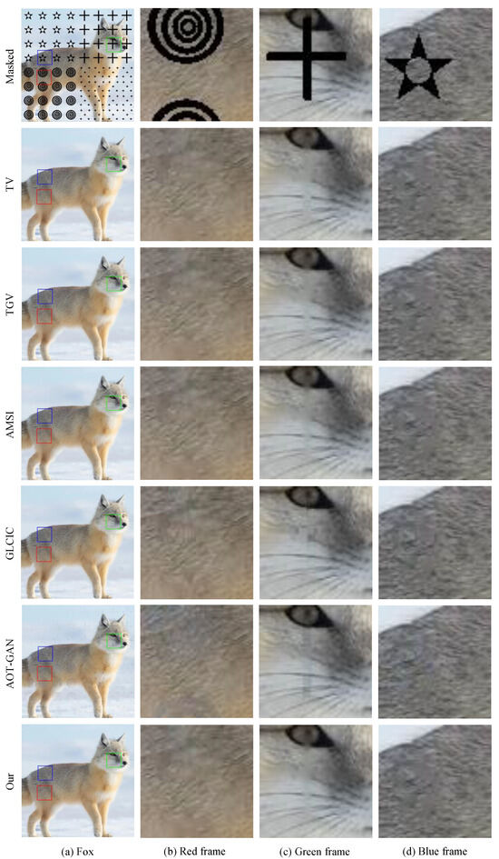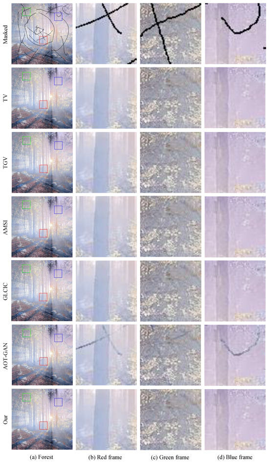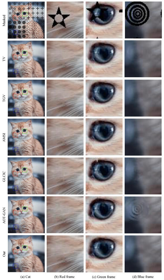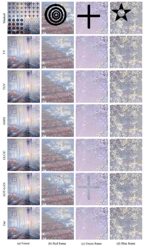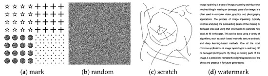 - Bertalmio, M.; Sapiro, G.; Caselles, V.; Ballester, C. Image Inpainting. In Proceedings of the 27th Annual Conference on Computer Graphics and Interactive Techniques, New Orleans, LA, USA, 23–28 July 2000; pp. 417–424. [Google Scholar]