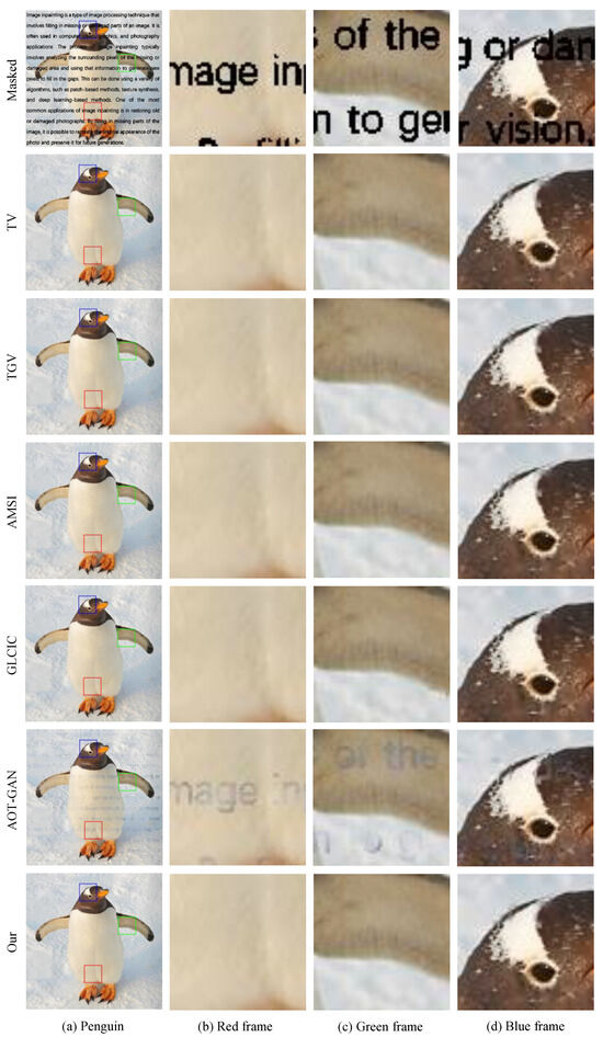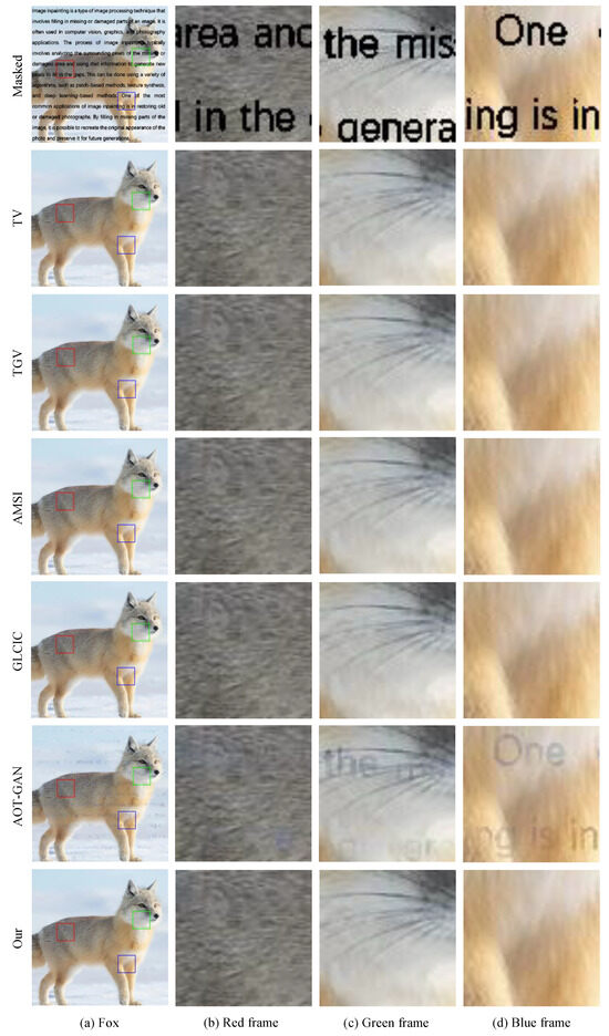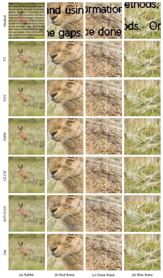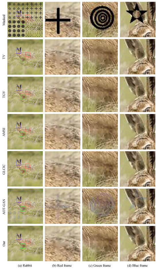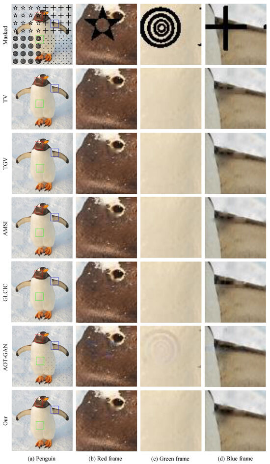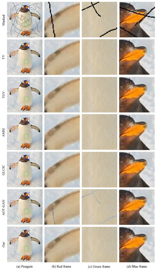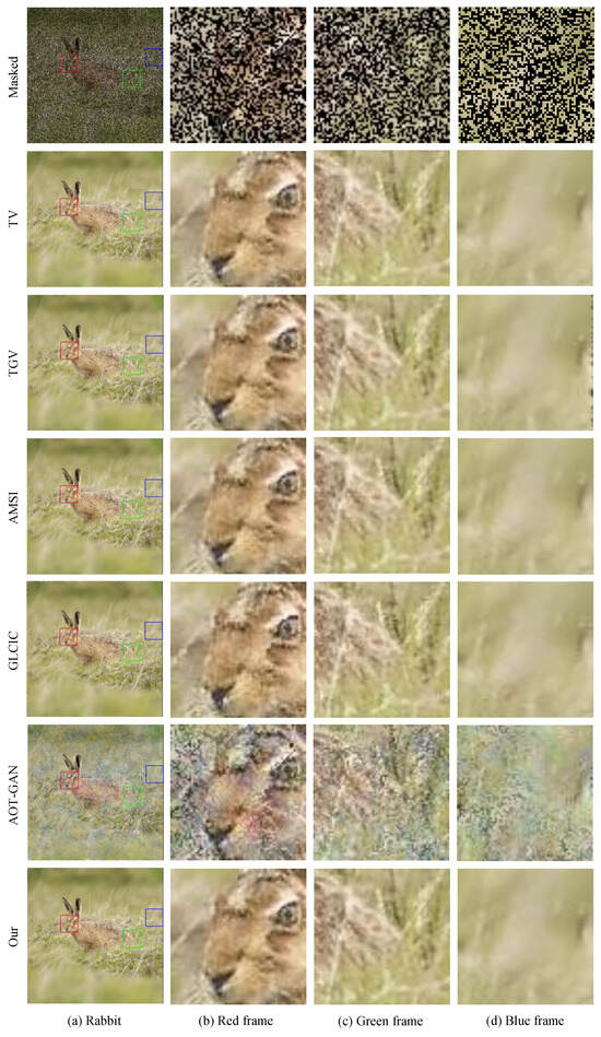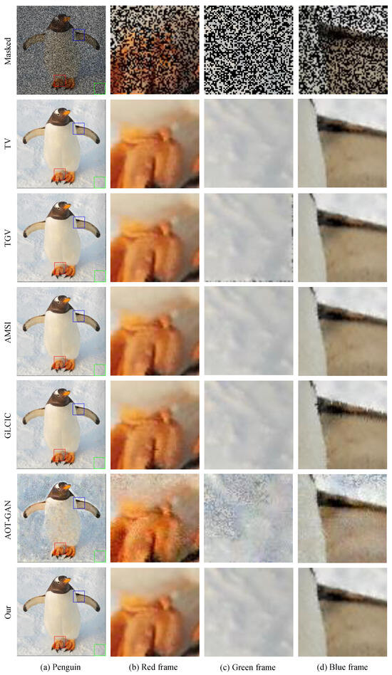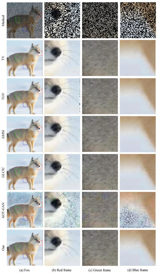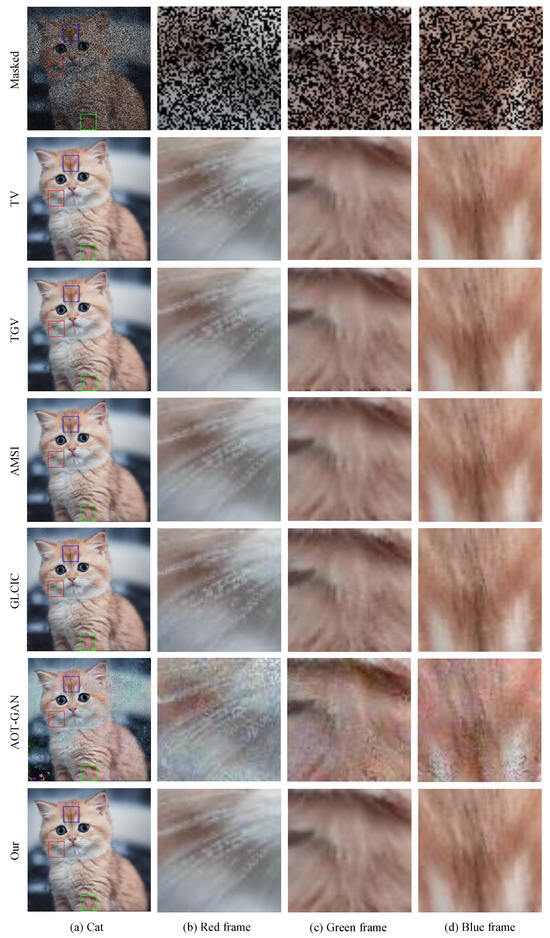 However, in the theoretical proof process, it is noted that the fractional Bessel potential space with is not a Banach space under the same norm definition, nor is it reflexive or separable. Since relevant theoretical research in this area is still ongoing, we have not extended our existence and uniqueness theorem to the case of . Consistently, our experiments demonstrate that as a parameter for image inpainting yields unsatisfactory performance. Given that the constraint at induces sparse solutions, there may be some special cases where better outcomes could be achieved. Therefore, future work should specifically investigate whether similar results hold for .