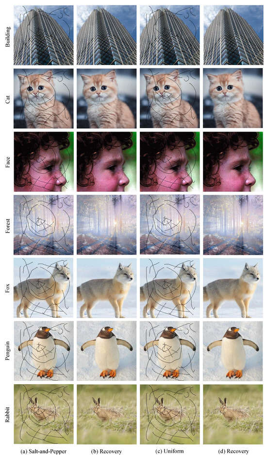 where is a regularization parameter, and is a regularization term that controls the smoothness of the solution. Total variation (TV) models, introduced by Chan and Shen [4], are particularly popular due to their ability to preserve edges while filling in missing regions. However, TV methods often struggle with large missing areas or disconnected regions, leading to the staircase effect [5]. To address these issues, higher-order models such as those by Lysaker et al. [6] and adaptive PDE methods have been developed, offering improved smoothness and edge preservation [7,8].