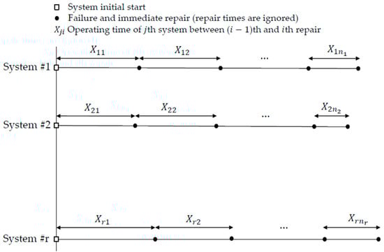 A multi-sample from a GP can be illustrated in the context of repair processes for repairable systems. Consider  identical repairable systems operating simultaneously, where each system undergoes immediate repair upon failure. It is commonly observed that the successive operating times of such systems tend to decrease after each repair. As a result, the sequence of operating times for each system can be suitably modeled by a GP. Assuming that all repair processes are homogeneous across all systems, the combined dataset of operating times from the  systems constitutes a multi-sample from a GP. This data structure, observed throughout the repair processes of the  identical systems, is illustrated in Figure 1.