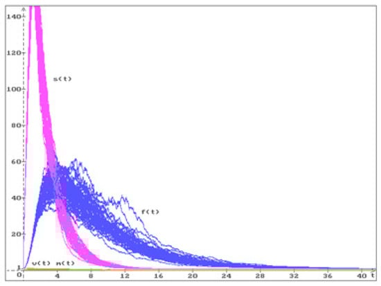 Consider equilibrium with the parameters from (8). In accordance with (14) and Remark 3, we obtain the following values for the equilibrium = . According to Remark 9, this equilibrium is unstable, even in the deterministic case. In Figure 2 50 trajectories of the system (20) solution are shown with , and the initial conditions