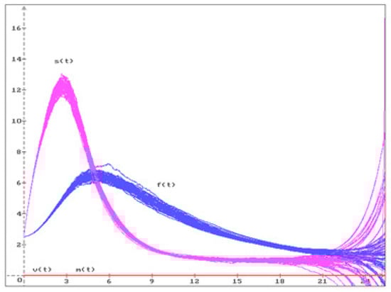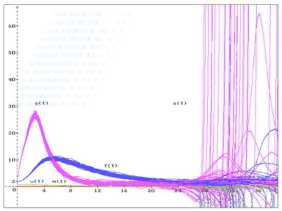 According to Remark 9, this equilibrium is unstable. In Figure 3, 50 trajectories of the system (20) solution are shown with , and the following initial conditions