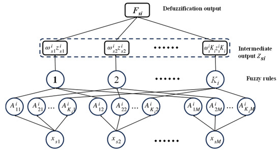 However, as long as it accurately describes the output within the domain specified by the fuzzy rule premise, fk can be any function. Such a fuzzy system is called a first-order TS fuzzy model when fk is a first-order polynomial. Another common model is the zero-order TS fuzzy model. The zero-order TS model can be viewed as a special case of another widely used fuzzy system—the Mamdani fuzzy system—where the conclusion of each rule is represented by a fuzzy singleton (or a defuzzified outcome). A schematic diagram of the TS model is shown in Figure 2.