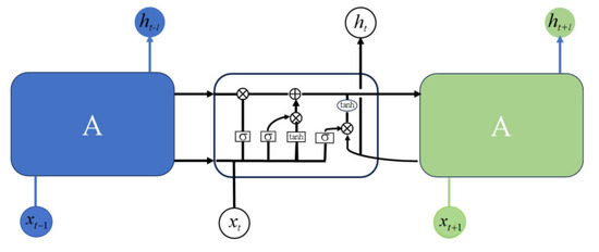 As shown in Figure 6, Long Short-Term Memory (LSTM) networks introduce gated units to effectively learn and retain long-term dependencies, making them more efficient in handling time-series data. Unlike traditional Recurrent Neural Networks (RNNs), LSTM replaces the single structure of RNNs with four interacting layers [32]. This design enables LSTM networks to flexibly manage time-series data, overcoming the vanishing gradient problem commonly seen in traditional RNNs and providing an effective solution for capturing long-term dependencies. The LSTM model is expressed as follows: