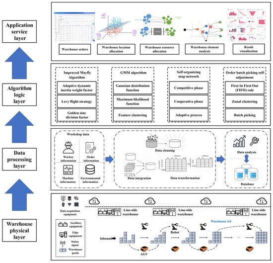 The integrated implementation framework for Warehouse 4.0-based inbound and outbound operations is shown in Figure 2. The framework is divided into four layers. The warehouse physical layer demonstrates the specific process of warehouse inbound and outbound operations. The data processing layer cleans and integrates the collected warehouse data, providing the foundation for data analysis. The algorithm logic layer showcases the core of the improved mayfly algorithm and the three-stage algorithm. The application service layer displays the specific applications of this framework.