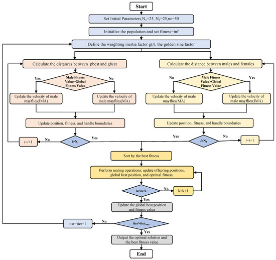 The paper introduces an improved mayfly algorithm, which primarily aims to adaptively adjust the variable parameter factors in the mayfly algorithm to enhance both the randomness and stability of the solutions. The following three improvements have been implemented in MA: