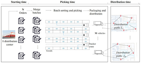 Research on large-scale order picking and distribution efficiency optimization focuses on parallel stacker operations and multi-vehicle collaborative scheduling strategies. Gao et al. established a dual-scenario order sequencing model under the constraints of order quantity, vehicle capacity, and processing time, employing heuristic algorithms to determine optimal scheduling schemes for identical processing/delivery time conditions [20]. Li et al. developed a single-machine production to multi-customer delivery integrated scheduling model utilizing genetic algorithms to minimize transportation costs and customer waiting time simultaneously [21]. Rasti-Barzoki et al. introduced an innovative joint scheduling framework integrating delivery time, production batches, and fulfillment costs, achieving 23% reduction in delayed operations and 18% decrease in comprehensive costs [22]. Suppini et al. proposed dynamic picking strategies through warehouse shape analysis and I/O point optimization, reducing picker travel distances by 15–32% [23]. Schumann et al. constructed a picking performance calculation model using mobility data, with case studies demonstrating 27% efficiency improvement through optimized picking surface layouts [24]. Modenov et al. formulated a production–inventory–transportation linear programming model, verifying a 21% operational cost reduction through multi-process coordination [25]. Han et al. designed an integrated production–inventory–distribution scheduling system, developing a pseudo-polynomial time algorithm that reduced backlogged operations by 34% [26]. Czerniachowska et al. proposed two solutions: a two-step mathematical heuristic addressing sequence-constrained order sorting and a CPLEX-based task allocation model that shortened order completion time by 19% through optimized picker assignments [27,28]. Tsang et al. created a multi-temperature IoT-enabled scheduling model for B2C fresh produce delivery, applying two-phase multi-objective genetic algorithms to enhance order processing capacity by 41% while improving customer satisfaction by 29% [29]. Mukherjee et al. developed a mixed-integer linear programming model to determine optimal pallet machine configurations, with experiments showing 28% resource utilization improvement [30].