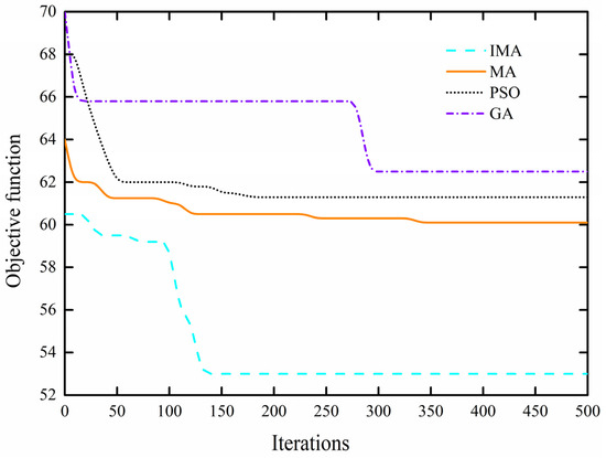 Comparison of simulation results between IMA, MA, PSO, and GA.
