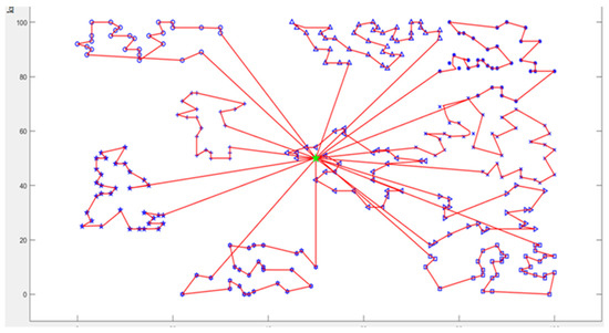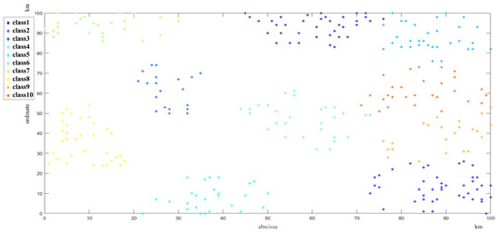 As shown in Figure 8, considering the vehicle’s load capacity, the improved GMM clustering algorithm divides the 300 customer locations in the case into 10 distribution areas. The number of goods required to be delivered by vehicles responsible for each area is as follows: first category 100 units; second category 100 units; third category 97 units; fourth category 94 units; fifth category 99 units; sixth category 99 units; seventh category 100 units; eighth category 100 units; ninth category 94 units; and tenth category 96 units. The horizontal and vertical coordinates in the figure represent the geographical location coordinates of the customers on the map.