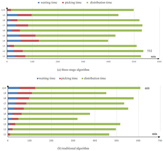 Figure 10 shows the Gantt charts for the picking and distribution of each area using the three-stage algorithm and the FIFO algorithm, respectively.