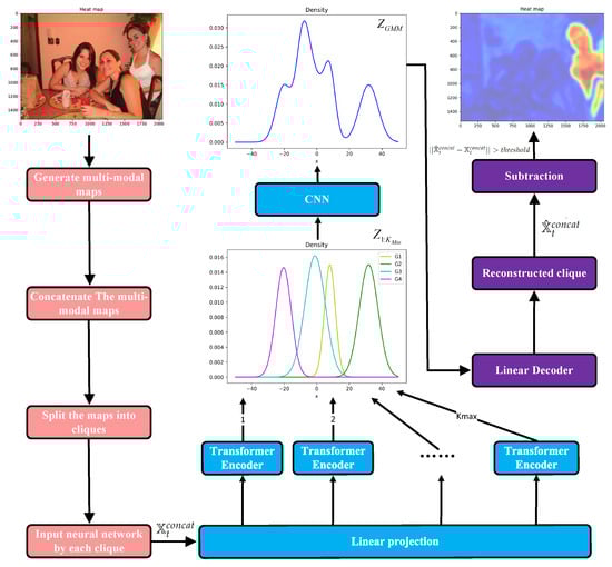 To enhance the performance of the vanilla VAE, some researchers combine it with a Gaussian Mixture Model (GMM) to approximate the posterior distribution , instead of relying on a simple single Gaussian distribution, making it more feasible for real applications [19,20,21,22,23]. The authors of [19] substituted with a GMM, as shown in Equations (4) and (6). This substitution results in the following new objective function: