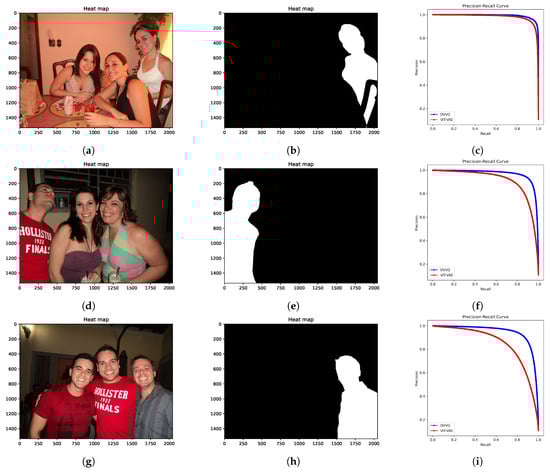 Precision-Recall (PR) curves for three test images. Columns (from left to right): (a,d,g) original images; (b,e,h) ground-truth forgery localization masks; (c,f,i) PR curves generated by the ViT-VAE model and our proposed DVVG model.