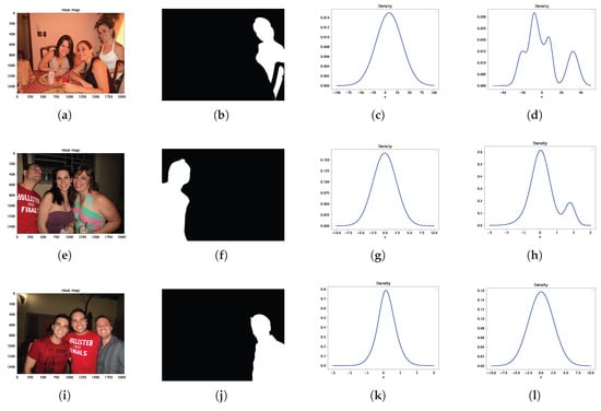 Visualization of the latent distributions of the ViT-VAE model and our proposed DVVG model on selected images. Columns (from left to right): (a,e,i) original images; (b,f,j) ground-truth forgery localization masks; (c,g,k) latent probability density functions (PDFs) generated by the ViT-VAE model; (d,h,l) latent PDFs produced by the proposed DVVG model.