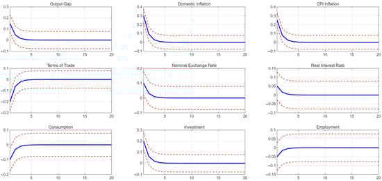 Figure 2 delineates the simulated outcomes of a monetary policy shock, revealing the nuanced interplay among key macroeconomic variables within the Chinese economic landscape. Each variable’s response provides critical insights into the effectiveness and limitations of monetary interventions, framed by contemporary theoretical and empirical literature. The immediate tightening of monetary policy significantly suppresses the output gap, indicative of the contractionary effects typically observed in response to higher interest rates. Recent findings from Li et al. [], Xiang and Li [], and Li et al. [] substantiate this observation, noting the pronounced sensitivity of China’s industrial production to shifts in monetary conditions due to heightened debt dependency among corporate sectors. Domestic inflation initially decreases sharply, highlighting the central bank’s effective short-term control over price stability. Nevertheless, the subsequent modest rebound suggests underlying structural rigidities in China’s pricing mechanisms, an interpretation consistent with the analysis by Liu et al. [], Chiang et al. [], and Pan et al. [], who argue that inflation dynamics in China exhibit delayed responsiveness attributable to extensive state intervention and regulated markets. CPI inflation mirrors domestic inflation closely, though its relatively subdued fluctuations emphasize the buffering effects of imported goods and exchange rate pass-through, as recently documented by Ji [], Hagemejer et al. [], and Ye et al. []. Their research stresses the integral role of global supply chains in moderating inflationary responses to domestic monetary shocks. The terms of trade initially improve marginally, likely reflecting the immediate competitiveness gains from a more robust currency valuation, before gradually reverting. This transient improvement aligns with Liao et al. [], Fernald et al. [], and Zhang and Vigne [] findings, indicating China’s complex trade dynamics, wherein short-term monetary tightening temporarily enhances export competitiveness through productivity improvements but risks long-term erosion as global market conditions adapt.