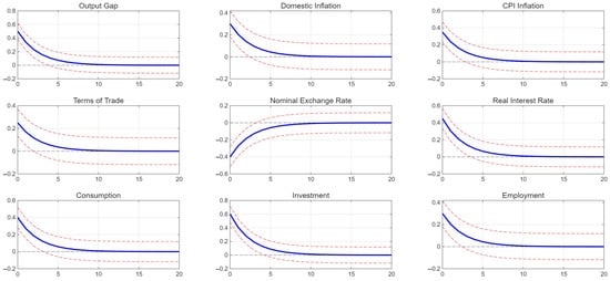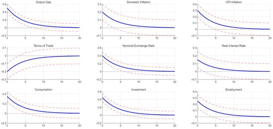 Figure 3 provides a comprehensive depiction of China’s economic response to a foreign income shock, elucidating key macroeconomic variables’ sensitivity and adjustment trajectories. The results underscore China’s interconnectedness with global economic conditions, offering significant policy insights. Initially, the output gap expands in response to rising foreign income, reflecting increased external demand stimulating domestic production. This positive linkage corroborates recent findings by Fambo and Ge [], emphasizing China’s export-led growth dependency. However, the gradual normalization highlights potential constraints in domestic productive capacity and structural rigidities, resonating with Woo’s [] observation of supply-side bottlenecks that temper long-term responsiveness. Domestic inflation experiences a modest increase, indicative of heightened demand pressures. This outcome aligns with Zhang [] and Zhou et al.’s [] findings, noting that inflationary impacts from foreign shocks in China are typically subdued by effective supply-chain management and policy interventions. CPI inflation mirrors domestic inflation closely but demonstrates milder fluctuations, reinforcing the buffering influence of global commodity prices and exchange-rate stability, as discussed by Lin and Xu [], Ding et al. [], and Chen and Miao []. The terms of trade improve initially, suggesting strengthened external competitiveness driven by favorable international market conditions. However, subsequent moderation points to China’s adaptive pricing strategies and changing global competition dynamics, consistent with the strategic export behaviors explored by Efrat et al. [], Wu et al. [], and Wang et al. []. This indicates a need for ongoing strategic adjustments to maintain competitive advantages.