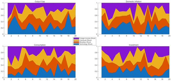 Figure 4 systematically elucidates the variance decomposition results, detailing how distinct structural shocks contribute to fluctuations in major macroeconomic indicators within China’s economic landscape. The analytical decomposition underscores each shock’s relative magnitude and evolving role over time, presenting nuanced insights critical for targeted macroeconomic management. The output gap’s variance is predominantly driven by cost-push and foreign income shocks, indicating the considerable sensitivity of China’s productive capacity to international market conditions and domestic production cost dynamics. This finding resonates with recent insights by Wang and Wei [], Duan et al. [], and Ma et al. [], who identify cost pressures and external demand volatility as primary determinants shaping China’s industrial resilience. For domestic inflation, cost-push shocks notably dominate in both short-term and long-term horizons, underscoring persistent inflationary pressures arising from domestic supply-chain inefficiencies and market rigidities. The prominence of cost-driven inflationary dynamics aligns with Li et al.’s [] analysis, emphasizing structural supply constraints as central inflation drivers in China. The variance decomposition of CPI inflation shows substantial contributions from foreign income and monetary policy shocks, reflecting China’s integrated role within global supply chains and the critical influence of domestic monetary policy responses. Wang et al. [] and Chen et al. [] similarly highlight the dual impact of global commodity prices and monetary policy on inflation, emphasizing their significant role in shaping China’s consumer price dynamics. The terms of trade variance is substantially influenced by foreign income shocks, consistent with China’s deepening global trade integration. The significant role of external shocks aligns closely with observations by Chen et al. [], and Rodrigue and Tan [], who document how global demand fluctuations directly affect China’s international competitiveness through strategic export pricing behaviors.