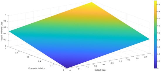 In Equation (35), denotes social welfare loss, and , , and represent deviations of the output gap, inflation, and real interest rate from their respective target or steady-state values, while parameters , , and reflect their relative weights, capturing the economy’s aversion to fluctuations in these variables (Clarida et al. []; Woodford and Walsh []; Galí []). Such an analytical framework elucidates not only immediate trade-offs but also intertemporal policy impacts, thus providing nuanced guidance for macroeconomic stabilization. Figure 5 graphically synthesizes these findings, highlighting policy implications for optimal stabilization strategies within China’s evolving economic environment.