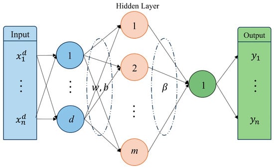 As a special single-hidden-layer feedforward neural network, ELM is a machine learning algorithm that offers a fast and efficient training process [38]. The structure of ELM is visualized in Figure 2. Notably, the core principle of ELM is to transform the iterative parameter optimization in traditional neural networks into a linear system solution problem by randomly initializing the connection weights and biases between the input layer and the hidden layer. Compared with the traditional backpropagation (BP) algorithm, ELM significantly enhances training efficiency while maintaining good generalization performance [39,40,41].
