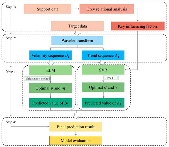 The proposed hybrid forecasting model (WT-SVR-ELM) in this study is based on the idea of signal decomposition and heterogeneous model fusion. It implements time-series forecasting through a four-tier cascaded structure of “preprocessing–decomposition–prediction–reconstruction” (as shown in Figure 3). The detailed procedure for implementing the model is provided below: