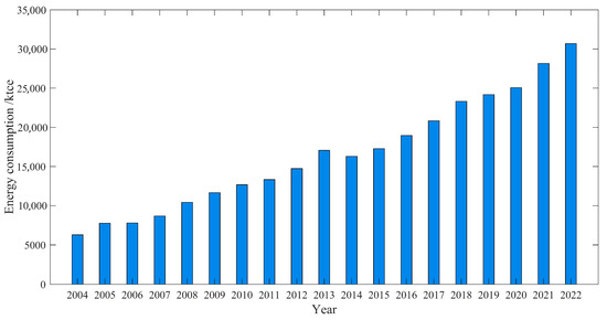 Based on the calculation methods presented in Table 1, the energy consumption data of civil buildings from 2004 to 2022 are presented in Figure 4. The energy consumption of civil buildings in Jiangsu Province exhibited an overall upward trend from 2004 to 2022. This trend is closely linked to economic development, the advancement of urbanization, and the improvement of living standards of the population.