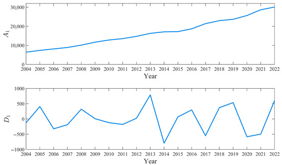 Figure 5 shows the two components after a single level of decomposition. The sequence captures the long-term trend information of civil building energy consumption, which has increased from 6415 in 2004 to 30,087 in 2022. The sequence ranges from −793 to 787, reflecting the high-frequency fluctuation information of the data.