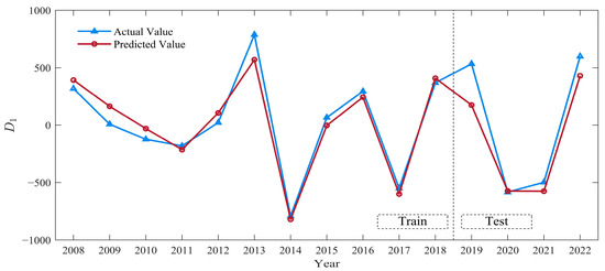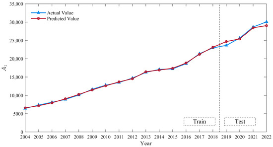 For the trend sequence , the SVR model was used for prediction. The data of the six influencing factors selected in Section 3.2 were used as inputs, and the energy consumption data were set as the output. The data were divided into two parts: a training set (2004–2018) and a testing set (2019–2022). The SVR model was trained with a Gaussian kernel, and the optimization ranges for the penalty coefficient and the kernel width were set to and , respectively.