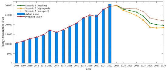 The prediction results for civil building energy consumption under three scenarios are shown in Figure 8. Scenarios 1 to 3 refer to the baseline scenario, the high-speed development scenario, and the low-speed development scenario, respectively. As illustrated in the figure, in all three scenarios, the energy consumption of civil buildings peaks in 2023 and subsequently shows a downward trend. Notably, in Scenario 2, while the economy grows faster than in the baseline scenario, energy consumption drops more rapidly. In Scenario 3, due to the relatively slow speed of development, the energy consumption remains high for a brief period and then slowly declines after 2023. By 2030, the energy consumption of civil buildings is expected to be between 19,154 ktce and 23,498 ktce. The civil building energy consumption does not follow a simple linear growth trajectory with the development of the economy and society. Instead, it shows an inverted U-shaped trend. This phenomenon can be interpreted through the Environmental Kuznets Curve (EKC) [62,63]. The EKC indicates that in the early stages of economic development, the expansion of economic scale will intensify both resource consumption and pollutant emissions, consequently deteriorating the environmental quality. With the further development of the economy, technological progress will enhance the efficiency of resource utilization and reduce pollution emissions per unit of output, thereby improving the environmental quality [64].