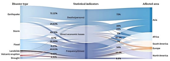 A total of 326 major natural disasters occurred worldwide in 2023, impacting 117 countries and regions. These disasters caused 86,473 deaths, more than 93.0524 million people were affected, and direct economic losses amounting to USD 202.652 billion [1]. For instance, on February 6, a magnitude 7.8 earthquake struck Turkey, leading to at least 54,603 deaths, 116,928 injuries, and direct economic losses estimated at USD 42.9 billion. Similarly, from late July to early August, the residual circulation of Typhoon “Doksuri” triggered severe flooding in the Beijing-Tianjin-Hebei region of China. This disaster affected a population of 5.512 million people, with 107 deaths and missing persons, and direct economic losses of USD 165.79 billion. Figure 1 illustrates the distribution relationships among disaster types, affected areas (AAs), and disaster-related statistical indicators. In its Sixth Assessment Report, the Intergovernmental Panel on Climate Change (IPCC) indicated that the severity of future natural disasters will continue to increase. This prediction underscores the urgent need for preventive and response measures against natural disasters on a global scale [2].