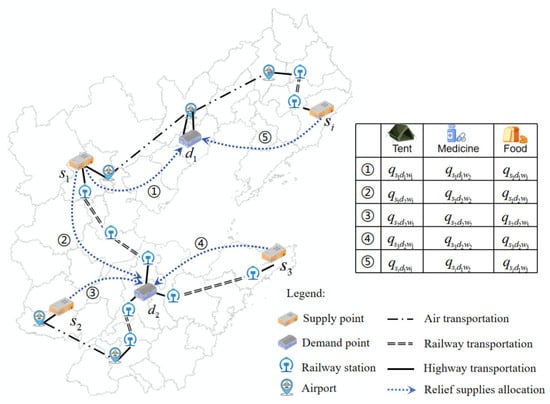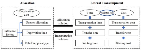Natural disasters often cause extensive damage, and locally stored relief supplies are typically insufficient to meet demand. Moreover, the AAs are usually unable to resume production in the short term. Therefore, it is necessary to transport massive relief supplies through lateral transshipment across inter-regions to meet the basic demand of affected populations [6]. As shown in Figure 2, there is significant interplay between the allocation and transportation of massive relief supplies during lateral transshipment. On the one hand, rational allocation strategies can optimize transportation routes, ensuring that relief supplies are delivered to the AAs rapidly and accurately. The optimal decision regarding the demand for relief supplies includes the type and the volume [7]. On the other hand, the smoothness of the transportation process directly influences the effectiveness of massive relief supplies allocation. This interplay necessitates that, in emergency logistics, the consideration of allocation and transportation must be integrated to achieve efficient distribution of massive relief supplies [8].