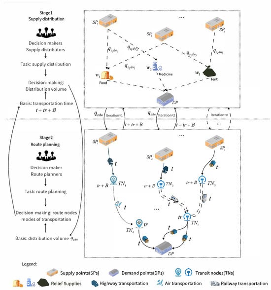 MRSIRLT is the process of selecting appropriate transportation modes to quickly transport massive relief supplies (food, tents, medicine, etc.) from SPs to DPs under limited space and resources constraints, as shown in Figure 3. Based on actual rescue situations, inter-regional lateral transshipment is divided into two stages, as shown in Figure 4: the first stage is massive relief supplies allocation, and the second stage is intermodality route planning. The decision-makers in the two stages are different; the first stage is the relief supplies allocator, and the second stage is the route planner. The decision content is different; the first stage decision-makers need to determine the relief supplies type and volume between different SPs and DPs based on demand and deprivation time. That is, it is assumed that there are types of relief supplies, , stored in , with demand points at , and decisions are made on the amount of relief supplies allocated from to . The second stage decision-maker decides on the intermodality plan from SP to DP. As shown in Figure 3, the transportation mode from to is highway, railway, highway. The decision objectives vary: the first stage aims to minimize the deprivation cost, while the second stage emphasizes minimizing the weighted cost of transportation time and costs. The two stages are interrelated and mutually constrained; the allocation volume obtained in the first stage is passed to the second stage for route planning, and the transportation time (travel time + transfer time + waiting time ) obtained in the second stage is fed back to the first stage as the basis for SP selection, and only SPs whose transportation time is within the time threshold can be allocated.