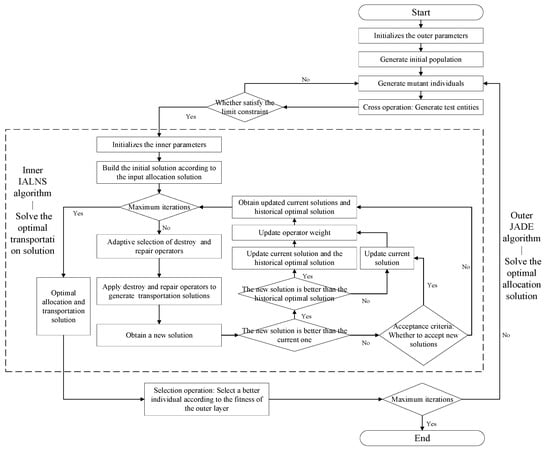 In this paper, a phased interactive JADE and IALNS optimization algorithm is designed to solve the model. The JADE algorithm solves the first-stage massive relief supplies allocation problem to determine the types and volume of relief supplies to be distributed from SPs to DPs. The obtained massive relief supplies allocation relationship is then further used as an input parameter for transportation route planning in the inner algorithm. In the second stage, the IALNS algorithm is employed to deal with the intermodality issue to optimize transportation routes from SPs to DPs. Before the second stage begins, we introduce a feasibility checking subroutine which verifies the network feasibility of the first stage results. If the result is not feasible, the subroutine will adjust the road network accessibility. In addition, after each iteration of the second stage, we introduce a double validation loop that ensures that the current solution satisfies the network feasibility condition. If the current solution is not feasible, the loop will adjust the solution until a feasible solution is found. Then, the allocation and transportation solutions are passed into the outer algorithm to select the optimal solution based on the fitness function and determine whether the number of iterations in the outer layer are satisfactory. If it is not satisfied, the obtained transportation solution is passed into the outer layer algorithm for selecting SP, and the iterative process is repeated and updated. If it is satisfied, the optimal solution is output. The algorithmic framework diagram is shown in Figure 5.