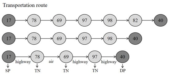 - TN: TNs refer to the locations where transfer operations take place between different transportation modes in intermodality, mainly including airports, railway stations, ports, etc. In the context of emergency rescue, due to the relatively slow speed of water transportation, which cannot meet emergency needs, this study only considers airports and railway stations. When transferring at these nodes, there will be certain transfer time and costs, as well as waiting time and costs associated with fixed transportation schedules.