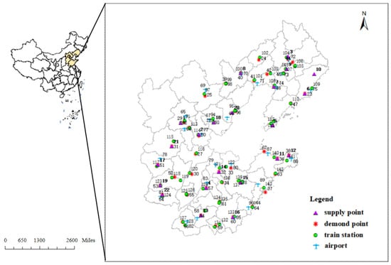 We design a post-disaster logistic network for MRSIRLT problem, as shown in Figure 3. The network is composed of three types of nodes: supply points (SPs), transfer nodes (TNs), and demand points (DPs).