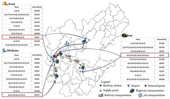 Transportation by a single mode has significant limitations due to the specific nature of relief supplies and the limitations of weather conditions and road traffic [42]. Intermodality has emerged as a more flexible solution, providing alternative options and addressing the complex demands of HL [43]. As a result, intermodality in HL has become a popular area of research that focuses on optimizing transport modes and efficiencies in order to improve the efficiency of emergency response [44,45,46]. However, research on multiple disaster relief supplies under intermodality remains limited [47].