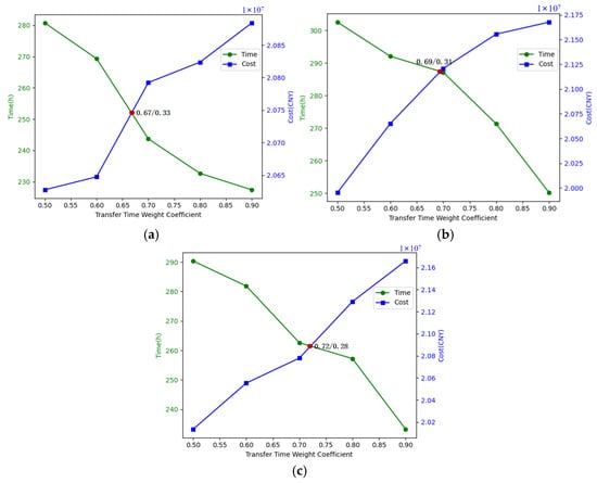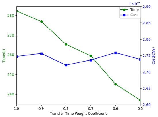 In Stage 2, we aim to optimize the cost and time. Objective function (7) minimizes the total time, including the transport time from SPs to DPs, transfer time from one transportation mode to another at the TN, and waiting time due to the transportation schedules; denotes the sum of the total time. Objective function (8) minimizes the total cost, including the transportation cost, transfer cost, and waiting cost at the TN; denotes the sum of the total costs.