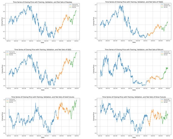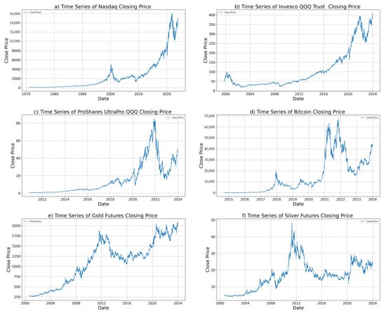 We selected six representative financial datasets, including the Nasdaq Composite stock index; the Invesco QQQ Trust and ProShares UltraPro QQQ exchange-traded funds; and gold, silver, and Bitcoin futures prices. The datasets comprise daily observations from 1 January 2021 through 1 January 2024. Each daily entry includes six features: closing price, opening price, daily high, daily low, trading volume, and the daily exchange rate.