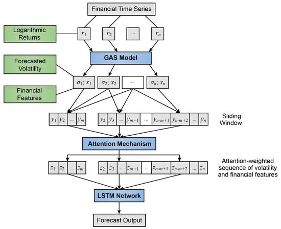 Based on the methodology proposed by [], this article presents the GAS-ATT-LSTM model, illustrated in the architecture of Figure 3. This hybrid model integrates the GAS framework with the memory capabilities of LSTM and an attention mechanism to identify key points within a time series sequence. At each time step, the GAS model leverages the entire historical dataset and the logarithmic returns of closing prices to forecast the next-day volatility of each financial asset. This projected volatility is incorporated into the original dataset and shifted one day forward. Thus, for any given day t, the input data comprise both the original features and the volatility forecast for day .