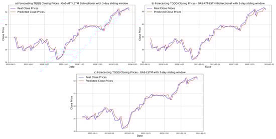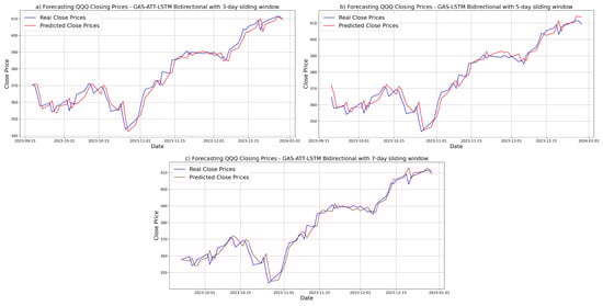 Figure 7 shows that the GAS-ATT-LSTM Bidirectional model achieved the best performance in the 3 and 7-day configurations, recording the lowest errors across all metrics. This highlights the effectiveness of combining attention mechanisms with bidirectional recurrence for stock price forecasting. Although the GAS-LSTM without attention performed competitively in the 5-day setup, the inclusion of attention clearly improved accuracy, particularly in capturing short-term variations in the QQQ series.