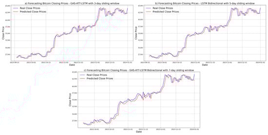Figure 9 shows that the GAS-ATT-LSTM model achieved its highest accuracy with a 3-day window, proving especially effective for highly volatile series like Bitcoin. For the 5-day window, the bidirectional LSTM outperformed hybrid models, suggesting that simpler architectures may be more robust at intermediate horizons. With 7 days, the bidirectional GAS-ATT-LSTM yielded the lowest errors, though with a slight drop in accuracy. These results highlight the importance of aligning model architecture with the forecast horizon.