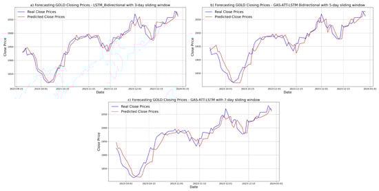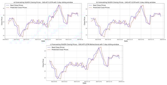 Figure 11 shows that the GAS-ATT-LSTM model achieved the best performance with 3-day and 5-day windows, confirming the effectiveness of the attention mechanism in modeling SILVER prices. For the 7-day window, its bidirectional variant recorded the lowest errors, suggesting that a longer historical context and richer temporal encoding can enhance accuracy. Overall, the results demonstrate that hybrid attention-based models are effective even for relatively stable assets.