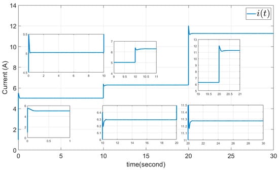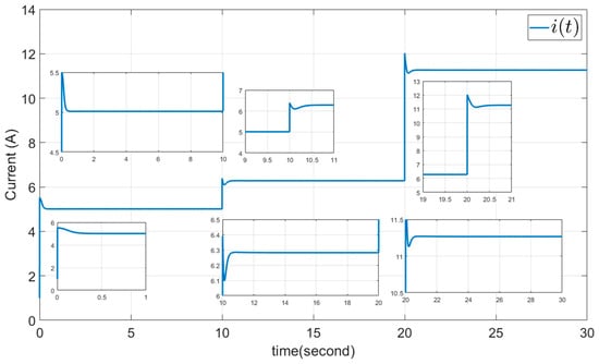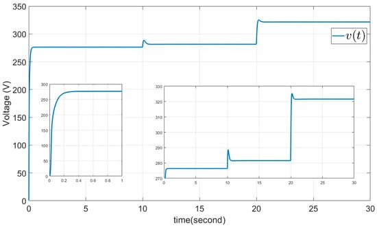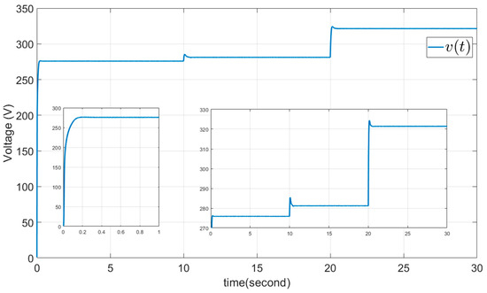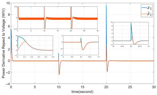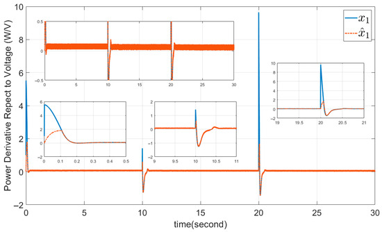 The parameters , , are selected as sliding surface coefficients, and we chose and . The initial value is selected as to calculate the input control from Equation (37). The results are presented in Figure 7, Figure 8, Figure 9, Figure 10 and Figure 11, all of them without chattering. Figure 7 shows the output power derivative with respect to voltage and its estimation, which are zero. It deviates from zero only when the solar irradiation and temperature are varying. Figure 8 shows the output current, which increases with rising solar irradiation and temperature, consistent with Equations (4) and (5). Figure 9 shows the output voltage, and Figure 10 presents the smooth duty cycle of the IBC (the output of PWM). The duty cycle also decreases to maintain the converter output voltage fixed at , when the output voltage of PVGS increases. Figure 11 shows the sliding surface and its finite-time convergence to zero.