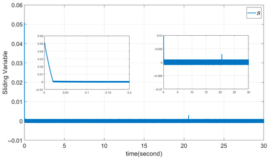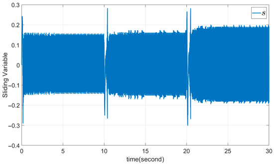 Here CSMC is used with the same parameters as the DSMC example. Hence, the coefficients of sliding surface (39) are set as , , and also and . The results are shown in Figure 12, Figure 13, Figure 14, Figure 15 and Figure 16.