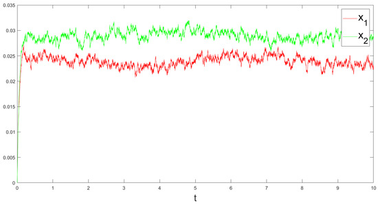 In summary, for the parameters considered here, the requirements of Theorem 1 are met, thereby ensuring the mean-square exponential input-to-state stability of the solution to the Equation (2). The numerical solutions are presented in Figure 1, offering a graphical demonstration that supports the stability of the solution. As observed, the trajectories remain within certain bounds, suggesting that the solution is stable. Nevertheless, it is not guaranteed that they will converge to the equilibrium state.