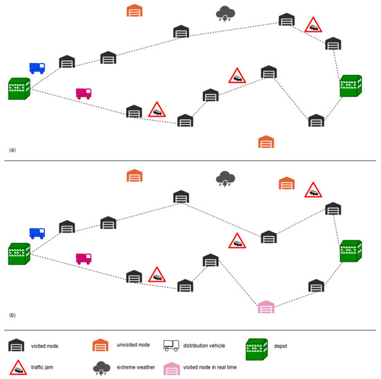Considering real-world deliveries further increases the complexity of last-mile delivery and urban logistics problems [18,19]. For example, delivery times cannot be assumed to be deterministic and static in these scenarios [20]. Travel delays may take place due to various factors such as heavy rain, traffic accidents, or rush hour congestion, all of which can increase travel times. For EVs, extended travel times may cause routes to be terminated prematurely before reaching their destinations, leading to decreased customer satisfaction [21]. Real-world scenarios involve uncertainties and dynamic conditions that require real-time decision making [21,22]. These decisions directly influence route planning and solution strategies. For example, weather changes or emerging traffic congestion may force a driver to select alternative routes, modifying the original plan. Such decisions cannot be predetermined before the route begins; instead, they must be continuously assessed and adjusted as the route progresses. Dynamic conditions are common in real-world problems like the one illustrated in Figure 1a [15]. In the example, two vehicles follow predefined routes from an origin depot to a destination depot, aiming to collect as much reward as possible within the allowed travel time. Traffic congestion can increase travel times and affect the feasibility of the planned routes. In the case of EVs, the planner must also account for limited driving range and battery status to ensure the vehicles can complete their routes. As shown in Figure 1b, unexpected delays (such as those caused by traffic congestion on a route segment) can be managed by adjusting the routes. In such cases, vehicles may still reach the destination and potentially visit other nodes to collect additional reward.
